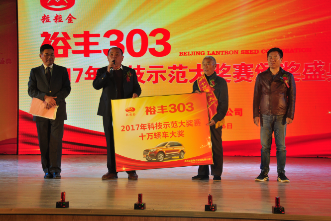 現(xiàn)場(chǎng)針對(duì)2017年221名裕豐303優(yōu)秀種植示范戶分別頒發(fā)十萬轎車、金磚、電動(dòng)三輪車獎(jiǎng)品,以表彰他們科學(xué)種田、示范推廣優(yōu)良品種裕豐303所作出的突出貢獻(xiàn)。其中一等大獎(jiǎng)價(jià)值十萬元的轎車被安徽蕭縣酒店鎮(zhèn)胡孝蘭摘得,其中參賽產(chǎn)量為2252.9斤;二等獎(jiǎng)價(jià)值5000元的金磚分別被河南省西華縣、滑縣、山東省梁山縣、陽信縣、河北省臨漳縣、任丘市、安徽利辛縣、泗縣、江蘇灌云到等20個(gè)縣市示范戶獲得,其中山東省平度市張舍鎮(zhèn)石賢勝畝產(chǎn)達(dá)2108斤、滕州市張汪鎮(zhèn)張佑代畝產(chǎn)達(dá)2025.36斤、河北省灤平縣大屯鄉(xiāng)王國(guó)強(qiáng)畝產(chǎn)達(dá)2040.28斤;二等獎(jiǎng)20名平均畝產(chǎn)達(dá)1800以上。